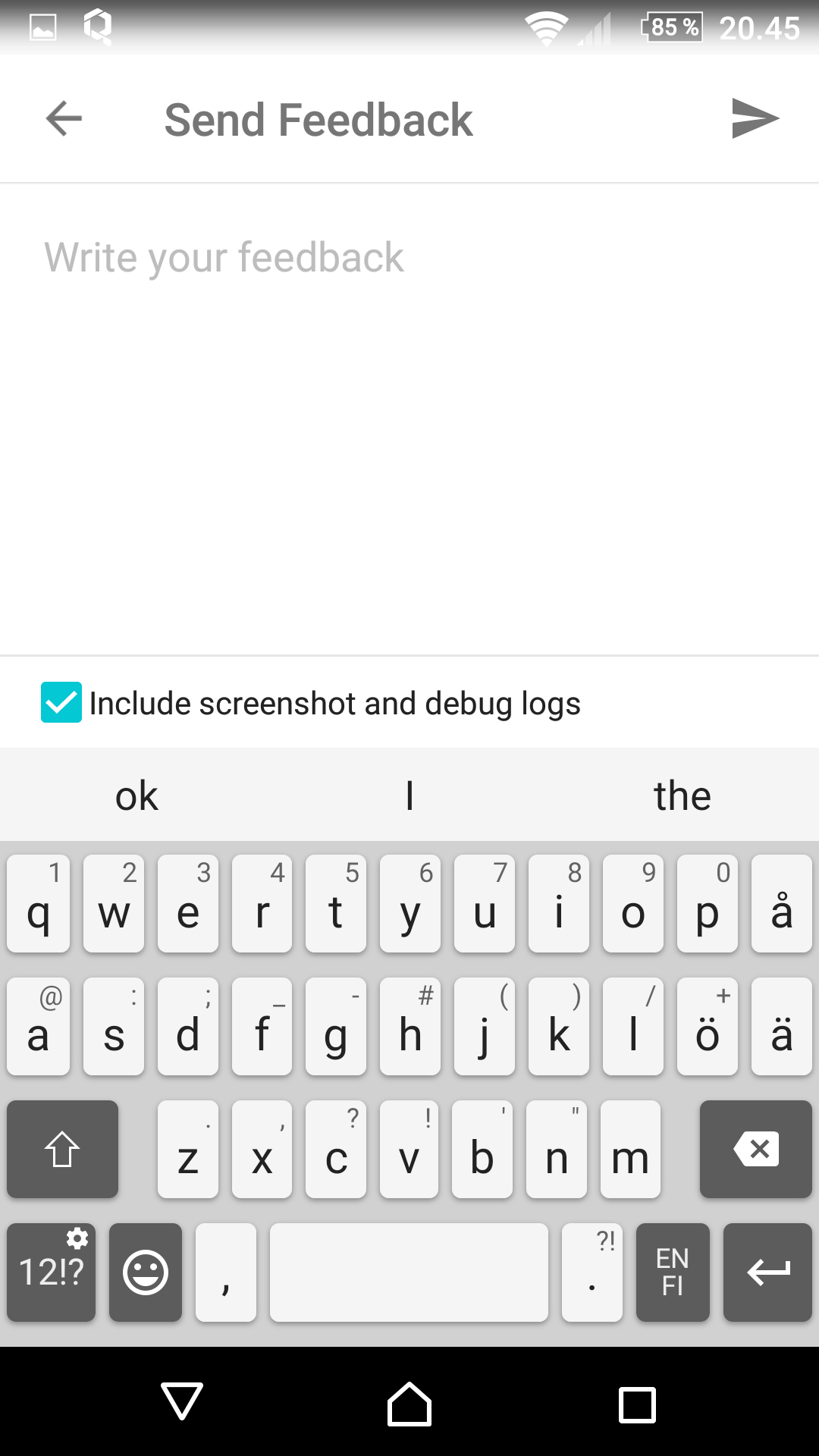 As I tried to explain above, I already tried this but here are screenshots how It looks on my device. I write the feedback and click the arrow on the upper right corner to send it, I got the popup shown in 3rd pic. Its in finnish, sorry about that, but it translates rougly ‘select sharing method or share in app:’ and I tried all of them but none of them worked.