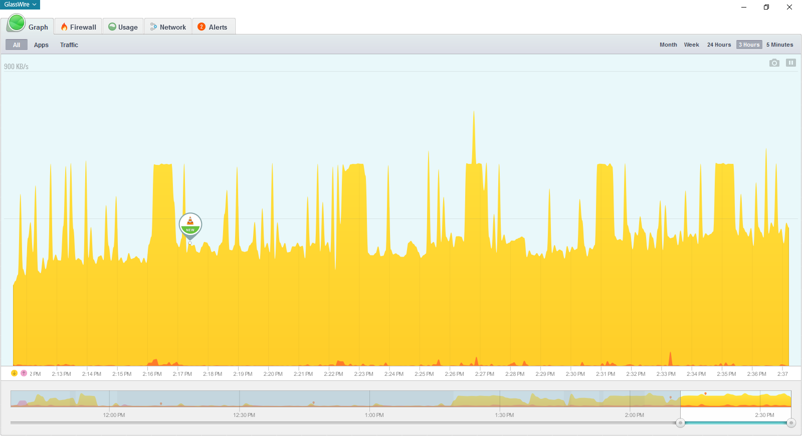 PerfMon in my system tray showed more like 7 Mbits, but it is always lower than the router graph. In GlassWire, the number depended on where my view cursor was set! Zoom out to show more time, and the download value under the top graph shows “63MB” - which is totally impossible via WiFi G. The top left scale of the top graph is only “40MB”: