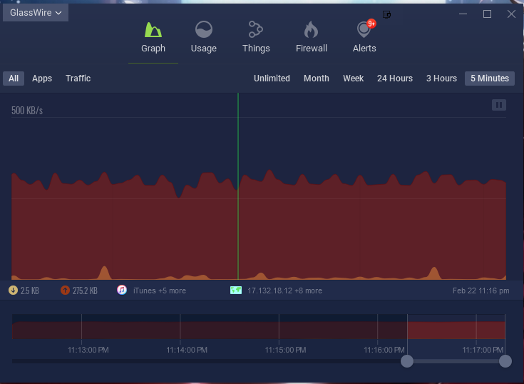 I apologize for the long delay- going back in time did not appear to produce repeatable results, so it required that I have a good amount of data to send to iTunes’ servers. Here is an updated screenshot of Glasswire under 5 minutes with sliders fully extended.