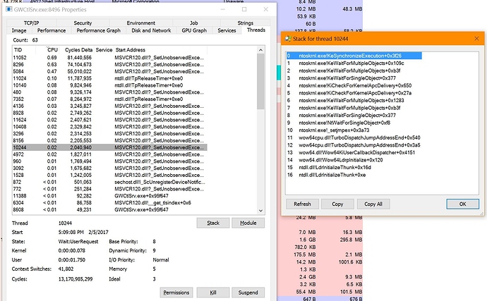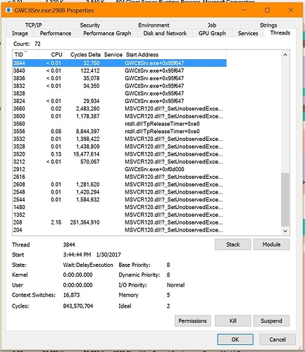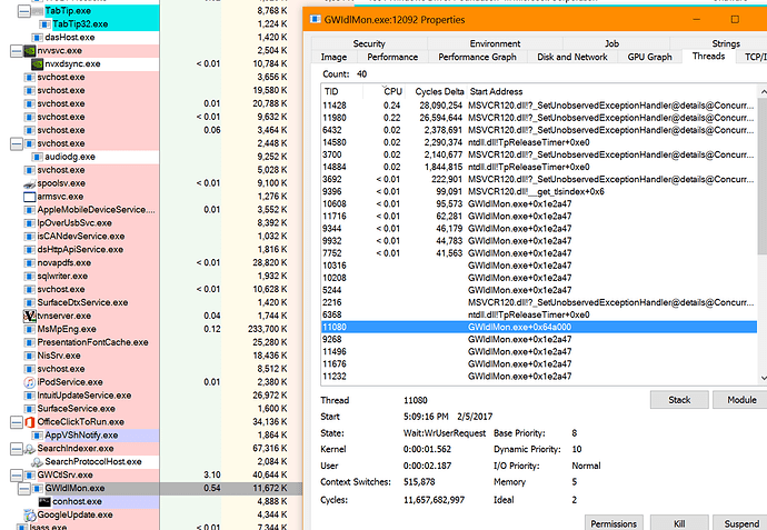 When the Thread view first opened, it was all “GWCtlSrv.exe”. There was a lot of flashing and then all the MSVCR lines appeared. They stay on the same thread numbers, rack up cycles, then let them go. Some of them are from this morning’s wake from hibernation, others from yesterday’s reboot. Both are occasionally active. Rarely some other single thread appears and closes. These all stay in the list.