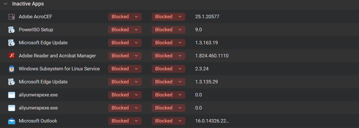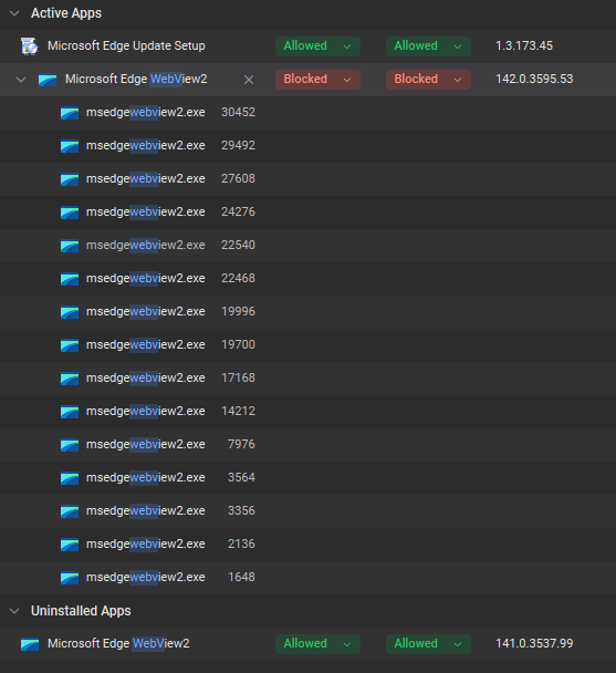Here is a fresh example of Edge WebView from today. A new version has been installed and silently blocked by GlassWire. Under Active Apps there is a single blocked entry with all the process instances listed. The parent process can be identified from the process ID (PID) if you are particularly interested to know what this is. The previous version has dropped into Uninstalled Apps. Allowing the new version will fix all these processes. Bulk delete can be used on Uninstalled Apps to clear all redundant entries.