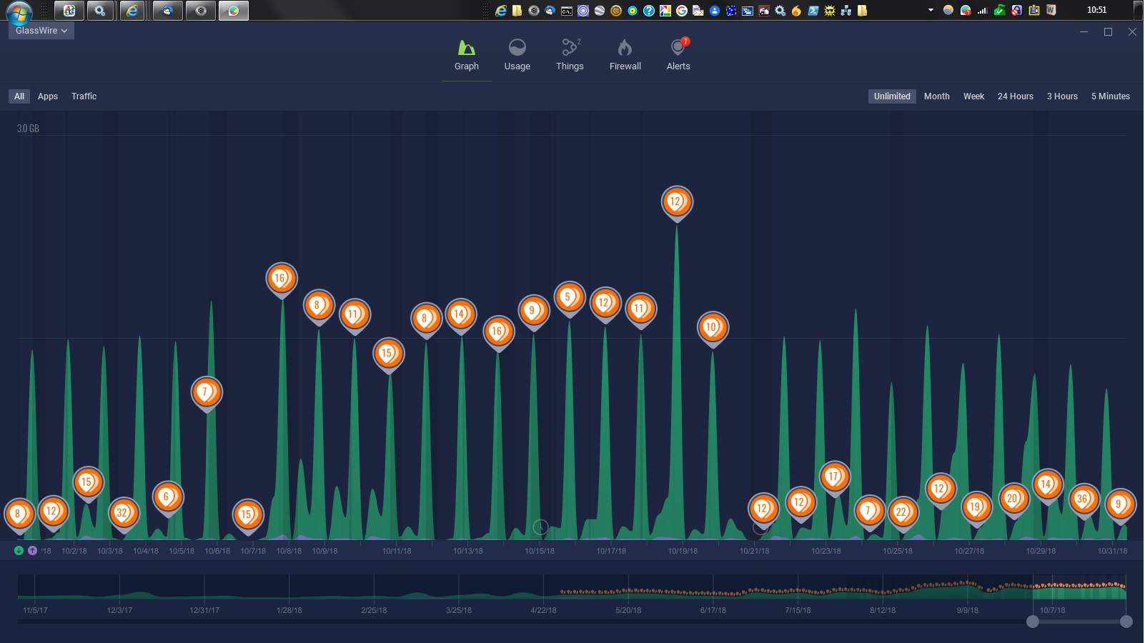 When I first start Glasswire (2.1.137) each day, the Unlimited selection on the Graph Tab only displays the previous month’s traffic. This requires that either I drag the left slider all the way to the left side of the screen each morning or that I select some setting other than Unlimited and then re-select Unlimited again to truly display my unlimited data. While Glasswire retains my full screen Unlimited setting for that session, shutting down and starting again requires the described slider tweaking. The screen shot shows the initial slider configuration. Is there a design reason for having the Unlimited graph display default to a shorter time period on the Unlimited selection?