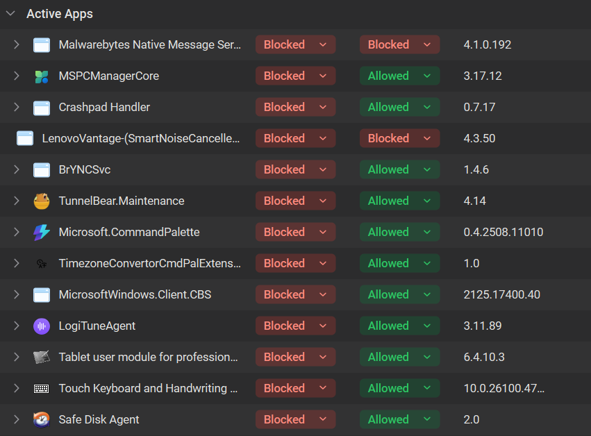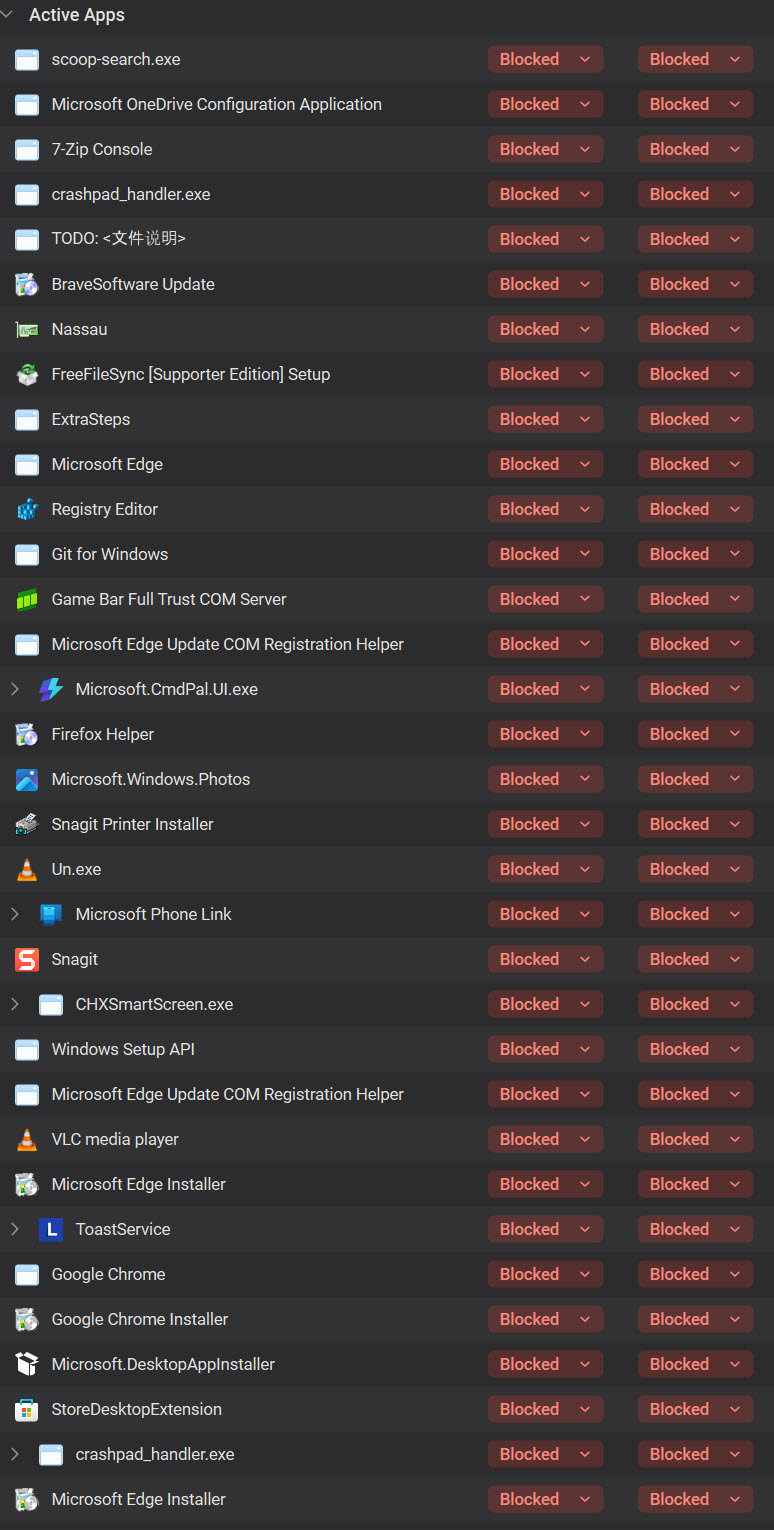 But, even if that’s the case, I have a problem with it. I want the list of apps to show as blocked, only those I explicitly blocked - which is a really short list. I want to easily see if I accidentally blocked something when I am having problems. An example would be if Microsoft Quick Assist is not working. I have - on occasion - accidentally blocked it, and it was really easy to find because I block so few programs. Now I have this big list to scroll through and try to find - is it “Quick Assist”, “Microsoft Quick Assist”, or is it because “Microsoft Edge WebView2” (which I discovered years ago that Quick Assist requires) was accidentally blocked?