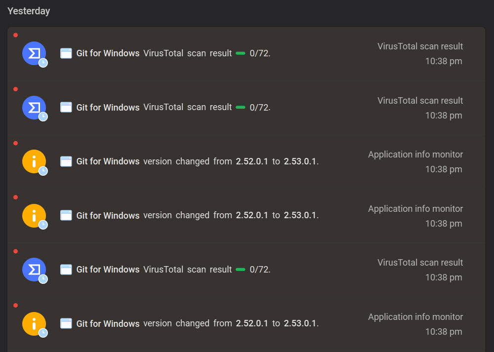 I have no clue why the logs show an identical version change 3 times, along with 3 scan results from VirusTotal.