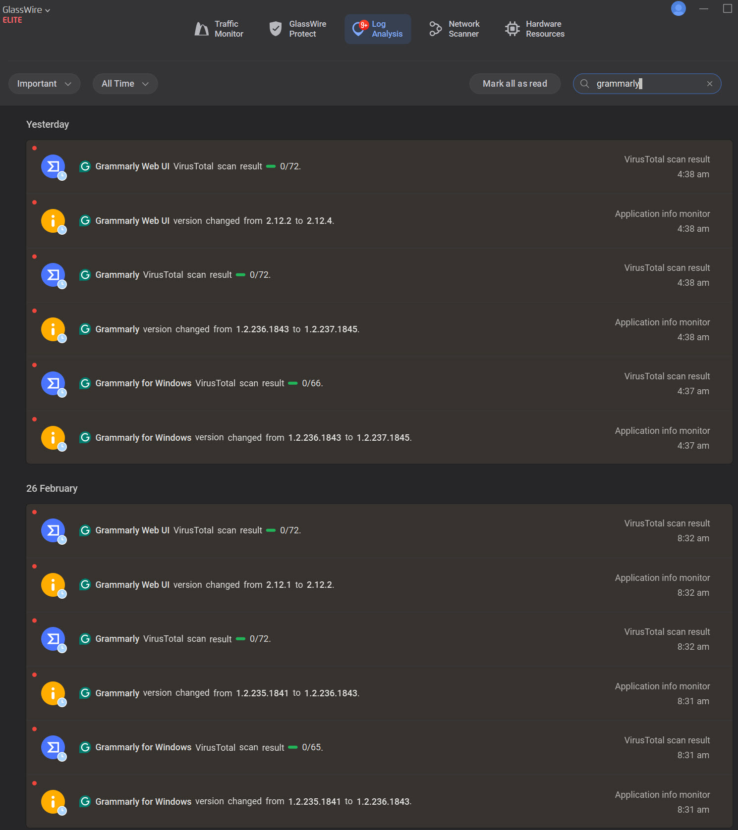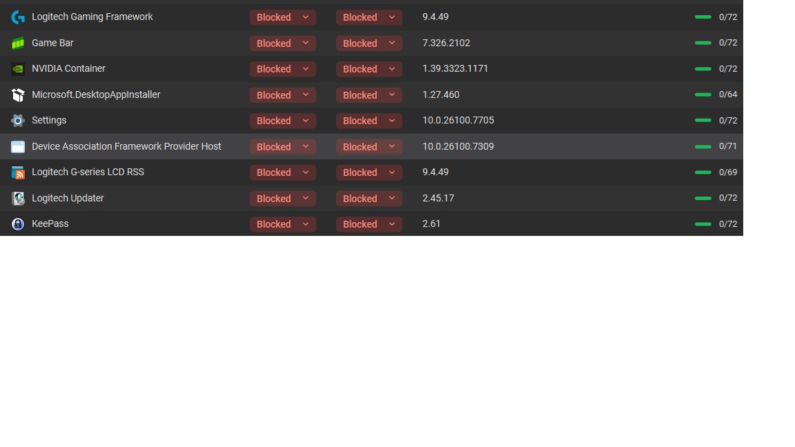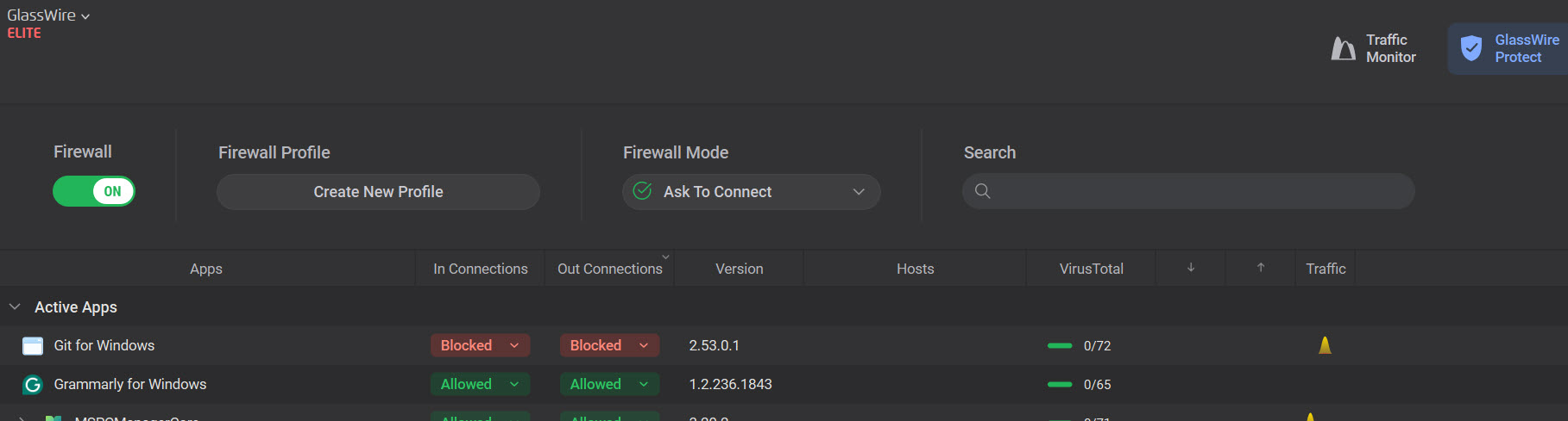 From your logs it looks like both Git for Windows and Grammarly are showing newer versions. When an app updates, GlassWire currently treats the new version as a separate entry, so the rule from the previous version doesn’t automatically carry over.