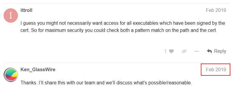 Having the option to allow or block by these categories would make things easier for certain programs that don’t retain the status when updating or that Glasswire doesn’t recognize as an updated version of the same program.